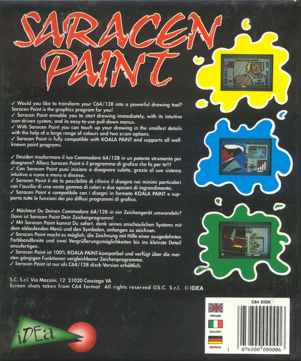 Il programma contiene una vasta gamma di colori e due opzioni di ingrandimento che permettono di rifinire il disegno nei minimi particolari. Saracen Paint è compatibile con i disegni in formato KOALA PAINT e con tutte le funzioni dei più'diffusi programmi di grafica.