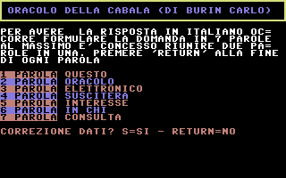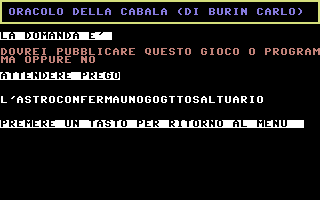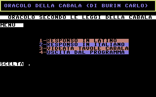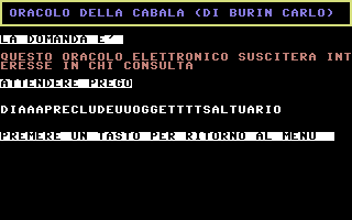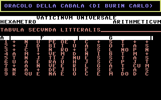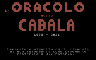 L'Oracolo della Cabala è un'opera di Carlo Burin, sviluppata nel 1986 e rimasta inedita per quattro decenni. L'autore, già attivo collaboratore di editori storici come JCE e Systems Editoriale, non ebbe mai l'occasione di presentare il software al mercato dell'epoca. Solo nel 2025, grazie al recupero e al dump dei floppy originali effettuato dallo stesso Burin, il programma è tornato alla luce. Funzionamento: il software, tramite un calcolo di conversione lettera/numero, riceve una domanda posta dall'utente e genera una risposta tramite la consultazione di apposite tabelle, interpretate e interpolate matematicamente in base ad un algoritmo. Logica Algoritmica vs Credulità PopolareA differenza della produzione commerciale "astrologica" tipica degli anni '80, questo software rifiuta totalmente l'uso di routine basate sulla casualità (RND). L'obiettivo non era sfruttare la credulità popolare, ma trasporre in codice la logica rigorosa delle antiche tavole di composizione. Il sistema adotta un algoritmo deterministico - un procedimento logico che, a parità di input, restituirà sempre il medesimo output, eliminando ogni fattore di imprevedibilità o "fortuna". Il cuore del software opera attraverso: