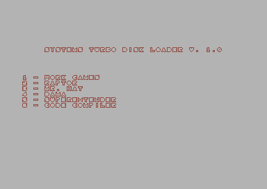 (*) TDE off e Virtual Device Traps on! NOTA: Il programma Raptor necessita di un RUN manuale dopo l'immagine introduttiva, se caricato tramite il Systems Turbo Disk Loader presente nel dischetto, Altrimenti, caricandolo senza turbo loader andrà in esecuzione autonomamente. Quest'anomalia appare essere verosimilmente un difetto di produzione originario. |