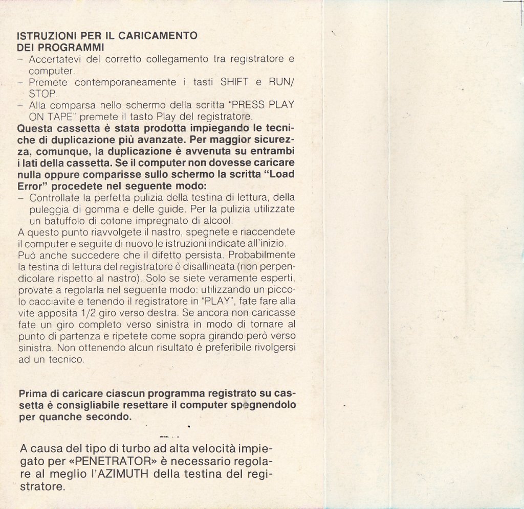 Nota: Un bollino adesivo sul retro della custodia in plastica della cassetta riporta il seguente avviso "N.B. Appena terminato il caricamento di "Penetrator", fermare manualmente il registratore essendo lo stop automatico disabilitato." |