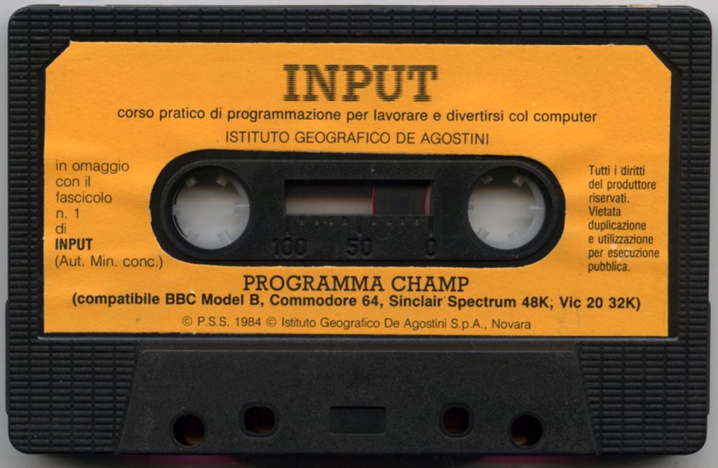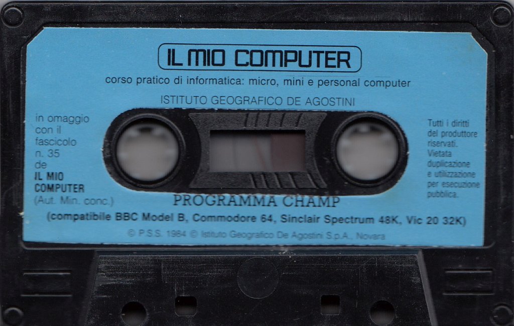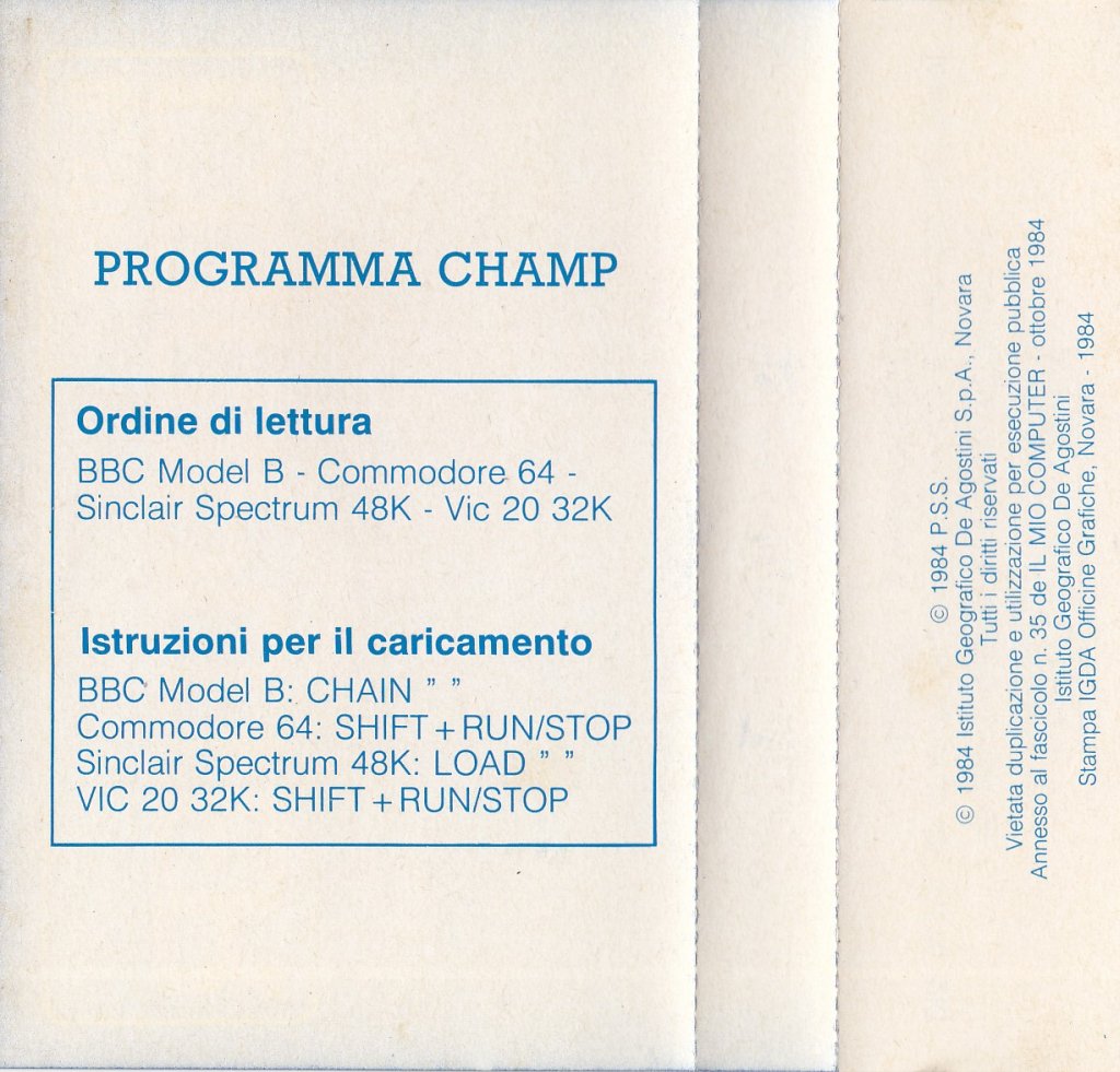 Champ Assembler era fornito con le enciclopedie "INPUT" (allegato al fascicolo numero 1) e "Il Mio Computer" (allegato al fascicolo numero 35) pubblicate dall'Istituto Geografico De Agostini. Entrambe le cassette contenevano lo stesso programma (e lo stesso "rumore" a fine TAP). All'interno del file zip è allegato anche il prg standalone, eseguibile con "SYS4096". CHAMP (Prima schermata del Programma) cold start: usare sys 4096 warm start: usare sys 4099 attenzione: i programmi assemblati senza alcuna direttiva org iniziano immediatement dopo il buffer dei testi/symboli. Tale indirizzo varia se viene modificato il testo. |