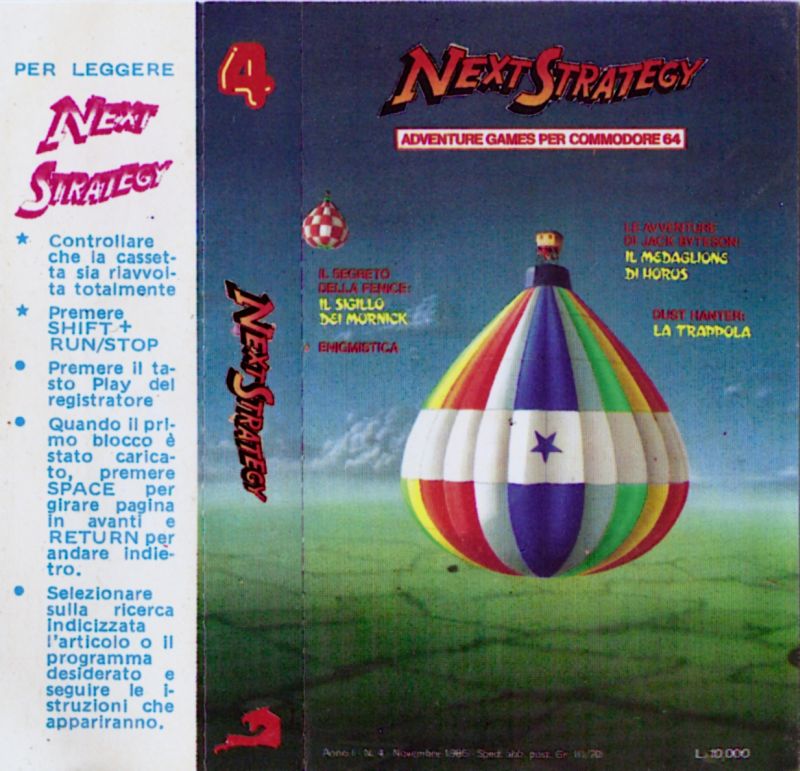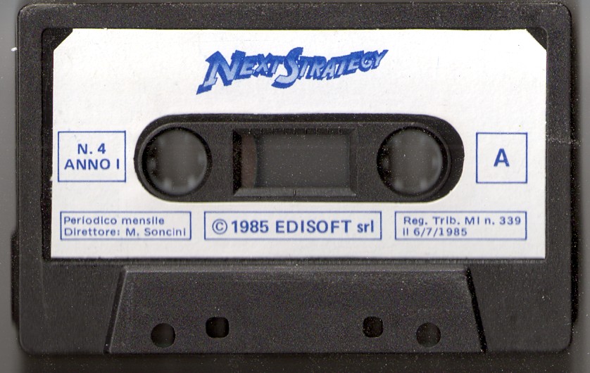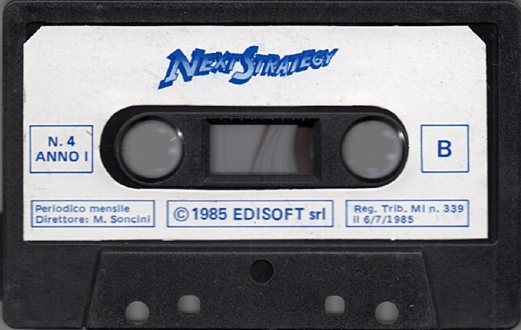 Next Strategy n.4 (Luglio 1985)NOTA: L'avventura "Jack Byteson - Il Medaglione di Horus" non è 100% funzionate. Una versione onefile del gioco fixato è attualmente in fase di test. Per sistemare il problema una volta caricato il gioco, entrare nel monitor di vice e digitare: >d016 c8 Sommario della cassetta: Lato A