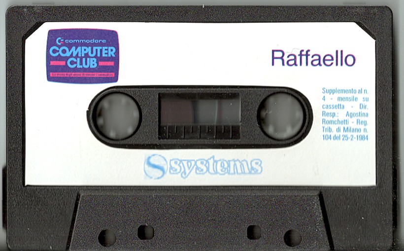 "Un programma completo per disegnare, a colori, con il C/64: linee, cerchi, quadrati eccetera. Valido sia per disegno a mano libera che geometrico. Cassetta L.10.000." Con le parole che avete appena letto veniva venduto, dalla Systems, l'editor di grafica bitmap chiamato Raffaello. Questo programma era da tempo nella missing list di Ready64, ed è stato recuperato grazie a Pixel, che si è occupato di convertire il nastro in formato .TAP e di inviarlo al sito, affinché potesse essere reso disponibile per tutti. Sulle qualità di Raffaello non ci vogliamo sbilanciare ma lasciamo invece il compito di descriverlo a Ian Coog che ha avuto modo di analizzarlo a fondo. Noi ci limitiamo a sottolineare comunque l'importanza storica di questo recupero, indubbiamente meritevole a priori, a prescindere dalla sua qualità intrinseca. Rispetto alla prima stesura del testo riportato a seguire, è necessario fare qualche precisazione. Raffaello: grandi aspettative portano spesso grandi delusioniL'analisi tecnica a cura di iAN CooGEra uno dei programmi più attesi perché introvabile. Ora che l'ho visto, come un bambino a cui hanno finalmente regalato il giocattolo tanto desiderato, scopro che potevo farne tranquillamente a meno. Trattasi di tal "Picture Painter" prodotto da Challenger Computer Software. Mai sentiti. Nessun riferimento su Google. Poi, più che un "Game That Wasn't" è meglio classificarlo "Game That Would Have Been Better Never To Be" talmente è malfatto... ma procediamo con ordine. Funzionava solo su cassetta. Tutti i caricamenti dei vari spezzoni del programma erano fissi su device 1, così come il salvataggio e caricamento delle immagini. Già questo a mio avviso lo rende inutilizzabile in modo serio. Una volta caricato, ci troviamo dinnanzi a un "desktop", poverissimo e con alcune lettere ai lati, e dei colori nella porzione superiore dello schermo. Giocando con la tastiera perché privo di qualsiasi istruzioni, scopro il tasto F8, help interno. Già qua possiamo constatare come la traduzione sia in certi punti approssimativa: che vuol dire quel "SECURA" al centro, in alto? Anziché "caricamento", inoltre, è stato messo un "Visualizza" che concettualmente è un po' diverso, credo. Le altre opzioni lasciano capire che si può disegnare "a mano libera", fare linee e doppie linee, riempimenti e svuotamenti. Il riempimento lo fa praticamente solo sulle aree considerate vuote, e qua il colore blu corrisponde al vuoto. Ogni altro colore, se usiamo F5 e clicchiamo non produrrà alcun effetto. Simile il comportamento di "svuota" che porta qualsiasi area in cui clicchiamo al colore di svuotamento... peccato che lo fa agendo sull'intera immagine e non solo nell'area circoscritta. Ogni punto di quel colore, anche se non nell'area cliccata, verrà "svuotato". Davvero geniale. Devo ancora capire se sono io che non ne trovo l'utilità o se davvero sia inutile. L'area di lavoro è limitata al rettangolo centrale, non c'è scrolling, quindi non si può fare editing a pieno schermo, ciò significa niente 160x200. Manca anche lo zoom, che è indispensabile al disegnatore professionale per rifinire le immagini. Passiamo al salvataggio e al successivo reload dell'immagine. Non ci riesco perché da emulatore non so come salvare e passo direttamente a farne una versione usabile da disco. DV=PEEK(186) all'inizio dei programmi e usato DV anziché 1 come device per i load, così da avere l'ultimo device usato. La routine "MACH PAINTER" l'ho patchata per riflettere questo valore, aggiungendo:
