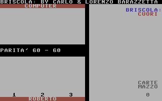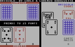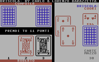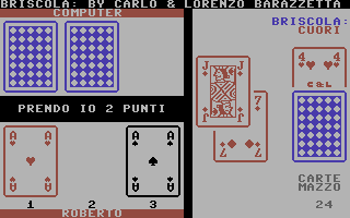 Il più tecnico dei giochi di Briscola presenti oggi nel database di Ready64. Si nota una cura dei particolari, una buona velocità d’esecuzione e l’apprezzabile autogestione di gioco, nel senso che non occorre premere un tasto quando si deve pescare. La buona programmazione ha portato a fornire, nelle fasi della partita, indicazioni come le carte rimanenti, i punti presi, il proprio nome e un uso grafico semplice ma efficace che non si è limitato a prendere i caratteri PETSCII già pronti per i vari semi ma li ha ridisegnati come fossero una vera carta da gioco. Dal canto mio le carte sono l’unico aspetto che mi ha lasciato interdetto ma solo per una questione d’abitudine in quanto per me la briscola è un gioco che va giocato con le carte italiane, ovvero quelle con i semi: oro, spade, bastoni e coppe. L’uso delle carte francesi non è affatto errato. É una questione di tradizione territoriale e vi sono zone come l’Italia Nord Occidentale (Piemonte, Liguria, Valle d’Aosta, zona est della Lombardia e la Toscana) dove è normale giocare con i cuori, picche, quadri e fiori. Io invece sono abituato con le carte siciliane che sono di origine spagnola che coprono, con diversi disegni ma medesime forme, il maggior numero di regioni (comprendo le più famose napoletane, le piacentine, le romagnole, insomma tutto il centro, il sud e le isole). Vi è anche in Alto Adige l’uso delle carte tedesche (foglie, cuori, campanelli e ghiande) e in ultimo un tipo tutto suo nel resto del nord, da Bologna fino a Trieste (spade a forma di scimitarra, coppe, denari e mazze di metallo). La differenza dei semi cambia anche le regole dei punti sulle figure. Se in quelli francesi il ‘Jack’ vale meno della ‘Donna’, nelle carte spagnole è l’inverso in quanto la ‘Donna’ viene prima del ‘Fante a Cavallo’.