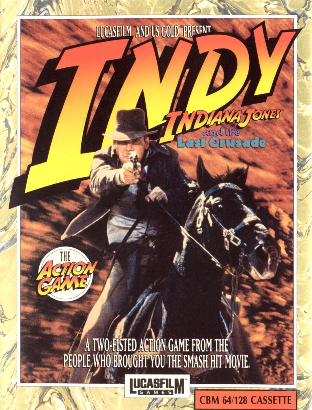 Tra un capolavoro epocale e un altro, la Lucasfilm pubblicò questo platform su Indy a ridosso del terzo episodio al cinema. Sfortunatamente affidò il "subappalto" a Tiertex, non proprio garanzia di risultati su c64. Un tema stridente introduce il primo e più convincente livello del gioco, nelle grotte, la cui luce si mantiene quanto più ci si rifornisce di torce, cercando la via d’uscita e blastando due o tre nemici. L’effetto buio è ben fatto, anche se non pare riguardare Indy. Si passa poi a uno sconcertante scenario su un treno, che si regola con qualche salto tra i vagoni, su un paio di giraffe e qualche corna e il gioco è fatto. Risparmio i rimanenti..non proprio offensivo,in virtù di una giocabilità standard platform-arcade, ma avvilente per assenza di spessore, un minimo di vivacità –ci saranno 10 nemici in tutto-, di un qualsivoglia tema musicale in-game. Un gioco poco fantasioso, scollato nelle varie parti che si attraversano in modo desolante quasi in completa solitudine.