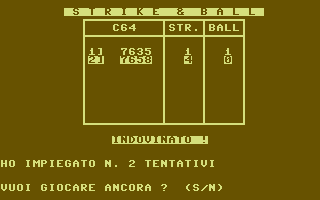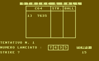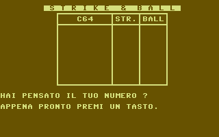 📌[...] qualche giorno fa è venuto a mancare un mio carissimo amico che negli anni '80 aveva scritto un bel gioco dal titolo Strike and Ball, una sorta di MasterMind numerico per commodore 64, realizzato parte in basic e parte in linguaggio macchina. Il gioco è stato scritto per giocare da soli, soli contro il computer a partita singola o intero torneo, e consta di due livelli di difficoltà. Sono riuscito a recuperarlo da dei vecchi floppy e trasformarlo nel formato leggibile da VICE, in modo che possa essere giocato in emulazione sui computer dei giorni nostri. Il gioco non è coperto da copyright e vi chiedo se sia possibile caricarlo sulla vostra piattaforma, in modo che la memoria di Gianni possa vivere attraverso la rete e gli appassionati di retrocomputing come me - Mail di Enrico Pirozzi