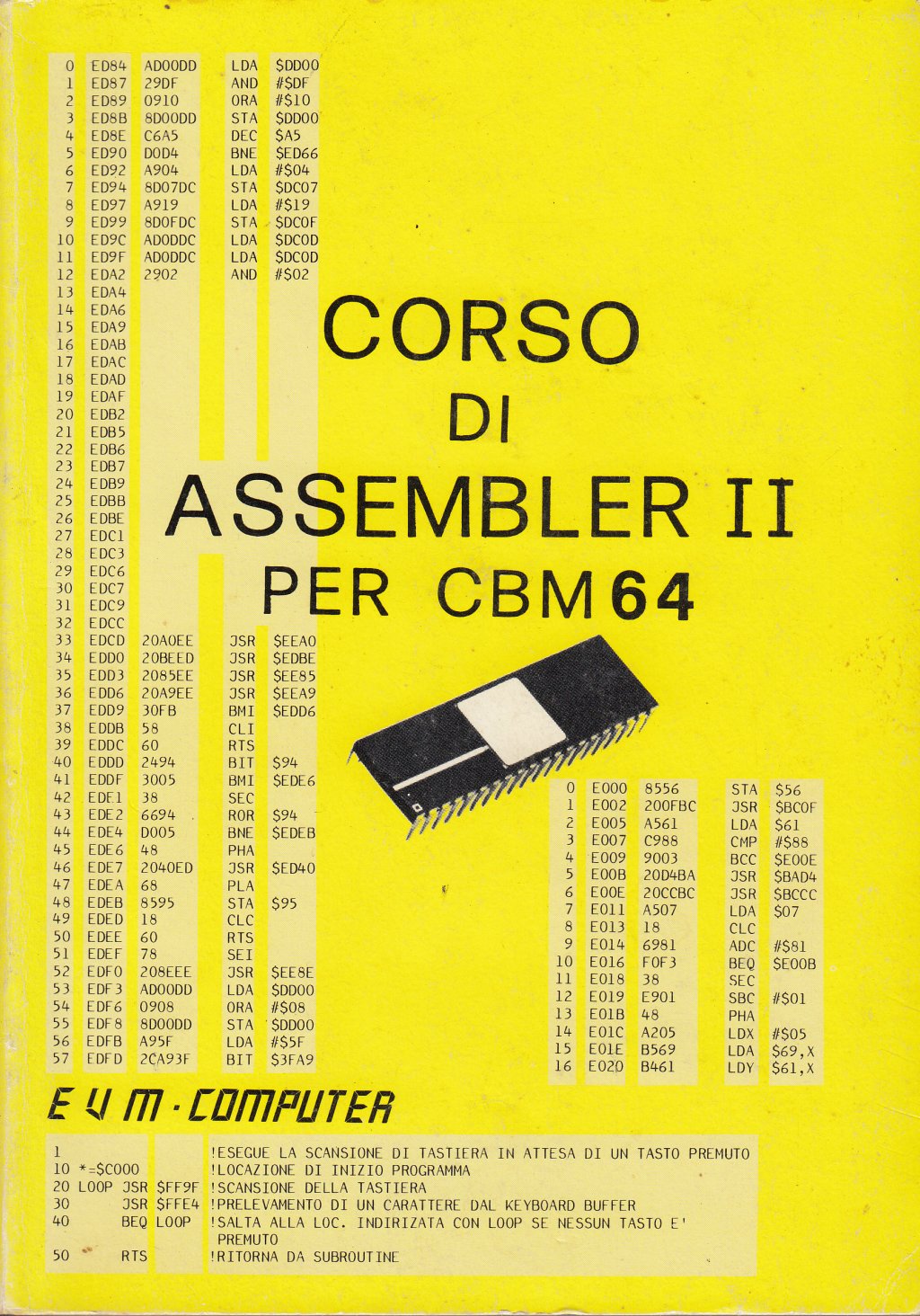 Una delle cose che scoraggiano maggiormente il normale utente del computer ad andare oltre il più o meno completo apprendimento del BASIC è il numero delle parole e più in generale dei termini da imparare. Questo corso si propone di insegnare ad un normale utente che non abbia necessariamente conoscenza di elettronica né di programmazione, ad usare il linguaggio Assembler. È infatti questa la strada per scrivere velocissime routines o interi programmi con un nuovo linguaggio e un nuovo sistema che danno una dimensione completamente diversa al lavoro sul computer CBM64.
