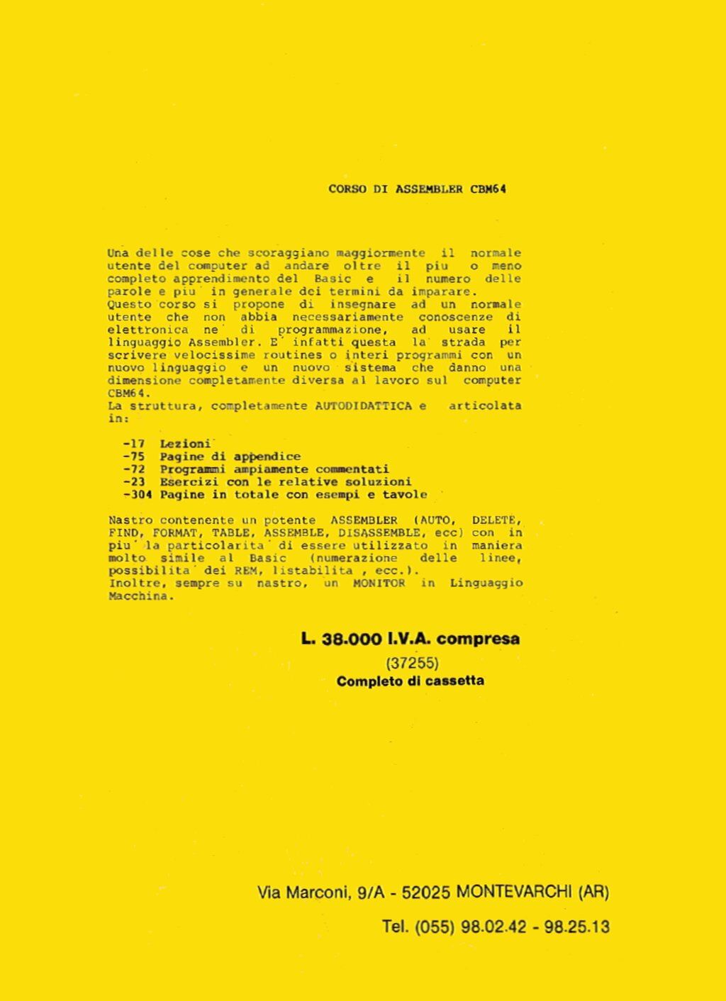 Nastro contenente un potente ASSEMBLER (AUTO, DELETE, FIND, FORMAT, TABLE, ASSEMBLE, DISASSEMBLE, ecc) con in più la particolarità di essere utilizzato in maniera molto simile al BASIC (numerazione delle linee, possibilità dei REM, listabilità, ecc.). Inoltre, sempre su nastro, un MONITOR in linguaggio macchina.